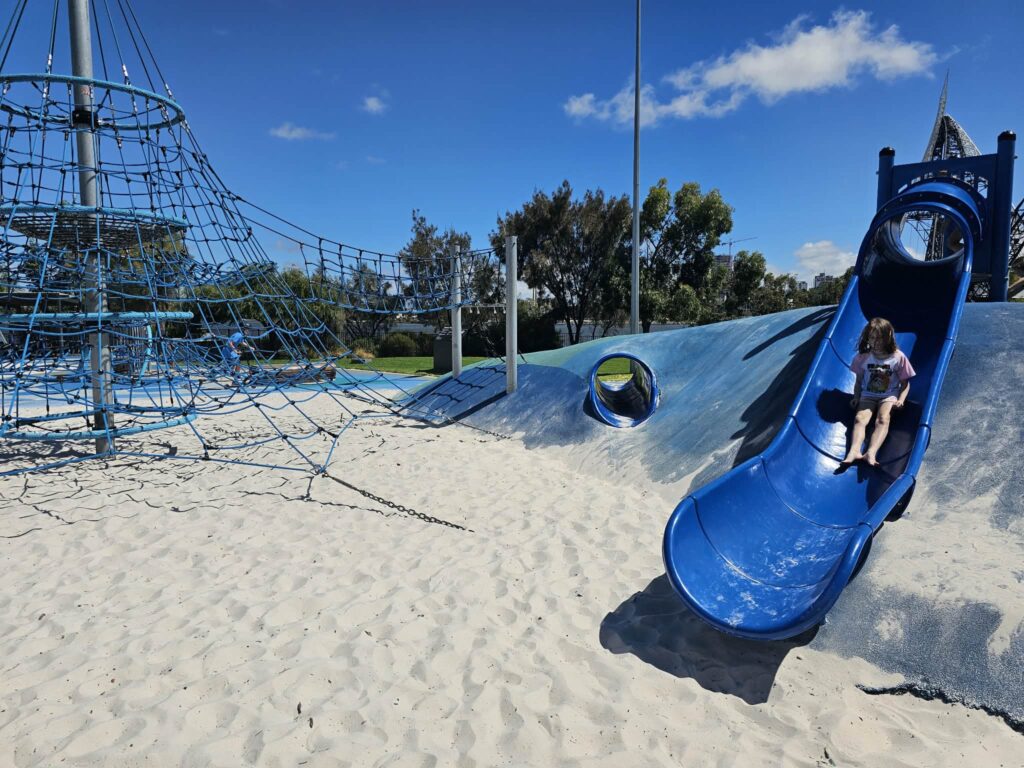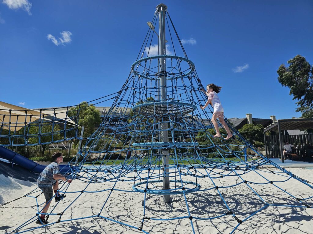 On non-event days, families can enjoy easy free parking in nearby car parks and make a full outing of it, combining a play with a walk around the river, a round of mini golf, a wander through Chevron Parklandโs nature play areas, or a stroll over Matagarup Bridge into East Perth. There are food and coffee options close by at The Camfield , the City View Cafรฉ at Optus Stadium (check operating hours and event days), and Mizzica Mangiatoria cafe (next to the mini golf). It’s easy to turn a simple playground stop into a day-long family adventure.