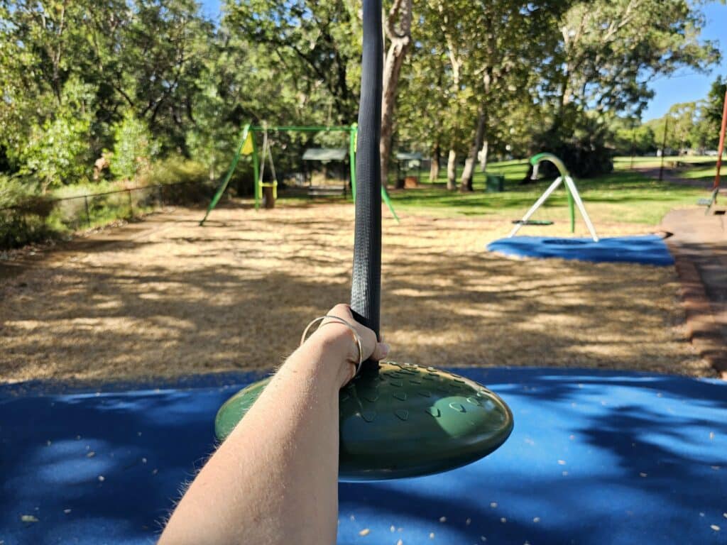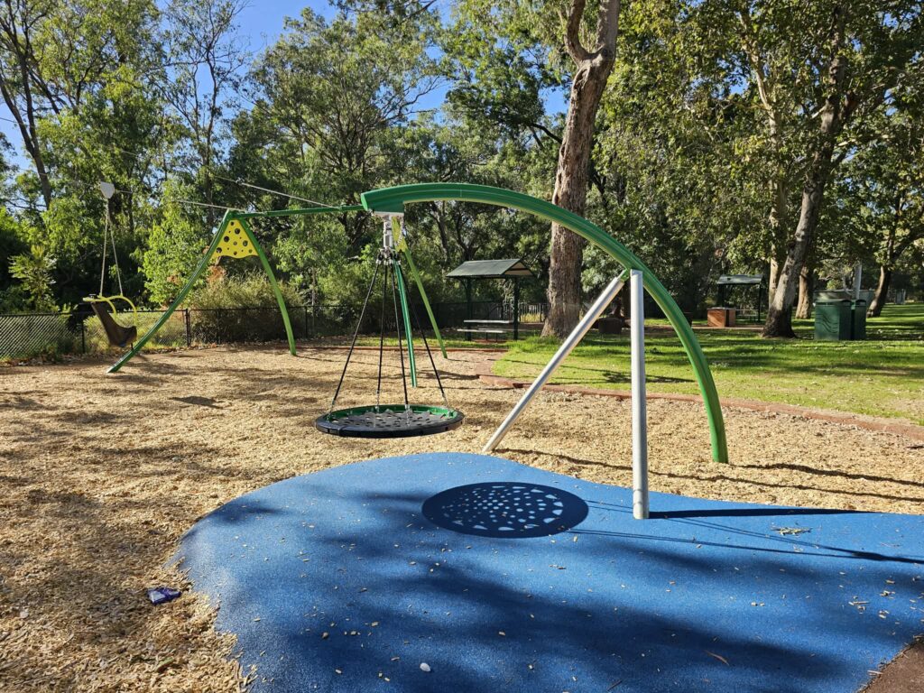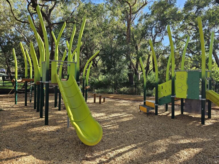 If youโre chasing a new playground, Rushton Park in Kelmscott is such a good one to have on your list. Found in the Perth Hills foothills, itโs close to bush trails for a pre- or post-play wander. The play equipment (replaced in late 2025), is vibrant and green, with reed-like green poles blending into the riverside spot.