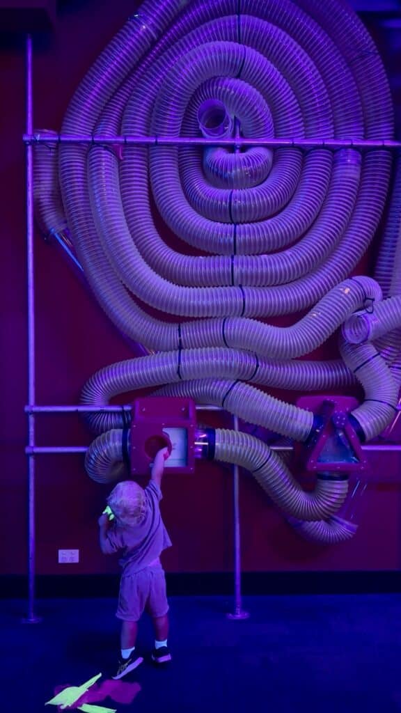 Nearby, the ever-popular tubing wall is a huge hit. Children can toss fluorescent fabric pieces into the vacuum-powered pipes and watch as they swirl and twirl their way upwards before shooting out of the top and floating gently back down, ready to be sent soaring again and again.
