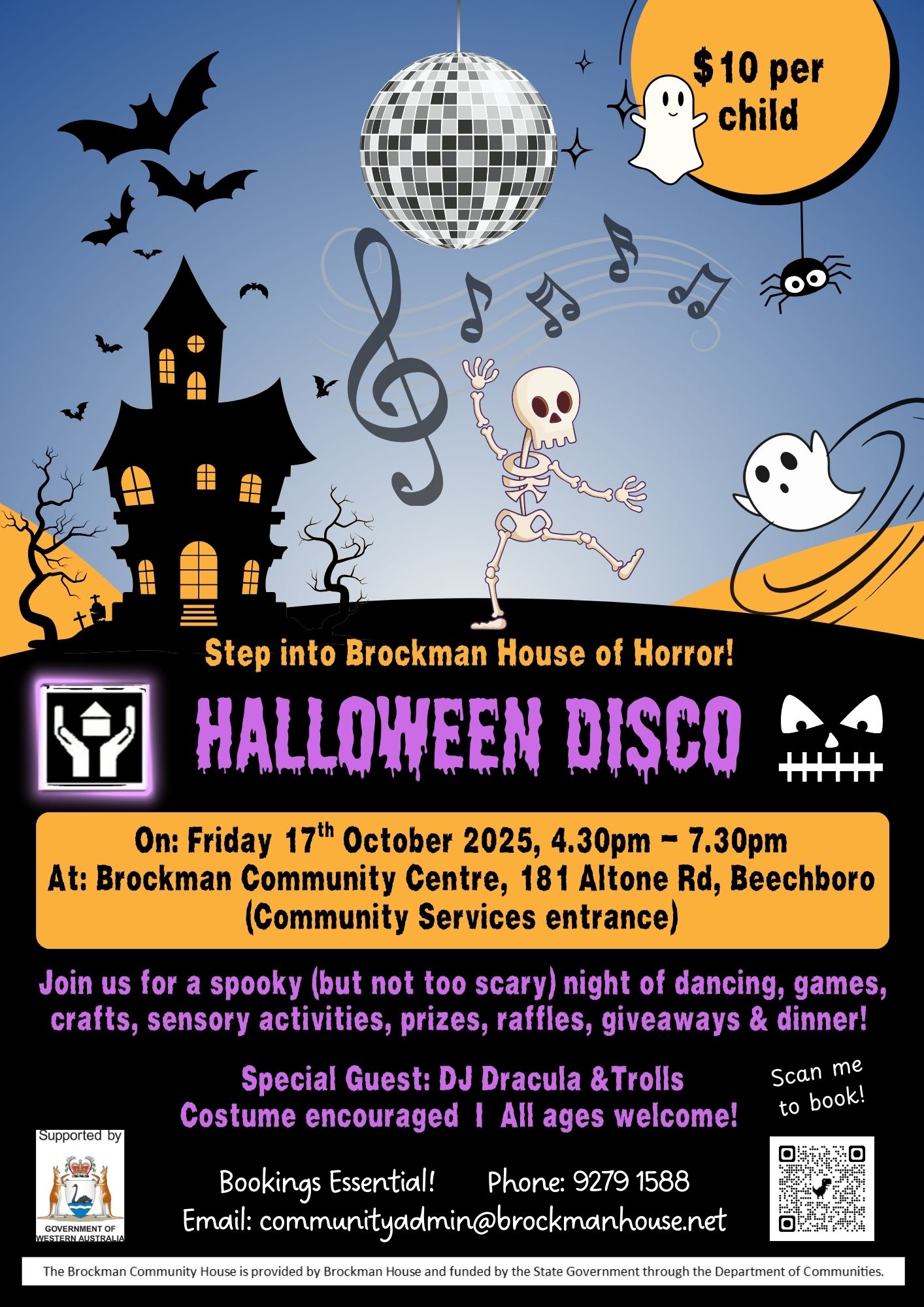 Brockman Community House 181 Altone Road, Beechboro, WA, AustraliaStep into the Brockman House of Horror! Get ready for a spooky (but not too scary) night of fun at our Halloween Disco! Friday 17 October 2025 4:30pm – 7:30pm Brockman Community Centre181 Altone Rd, Beechboro (Community Services entrance) Join us for: Dancing with DJ Dracula & the Trolls Games & Crafts Sensory Activities Prizes, Raffles & Giveaways Dinner included! Costumes encouraged – All ages welcome! $10 per […]